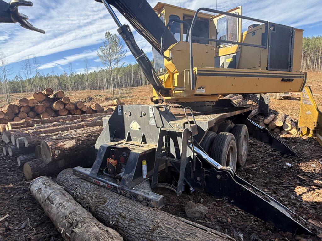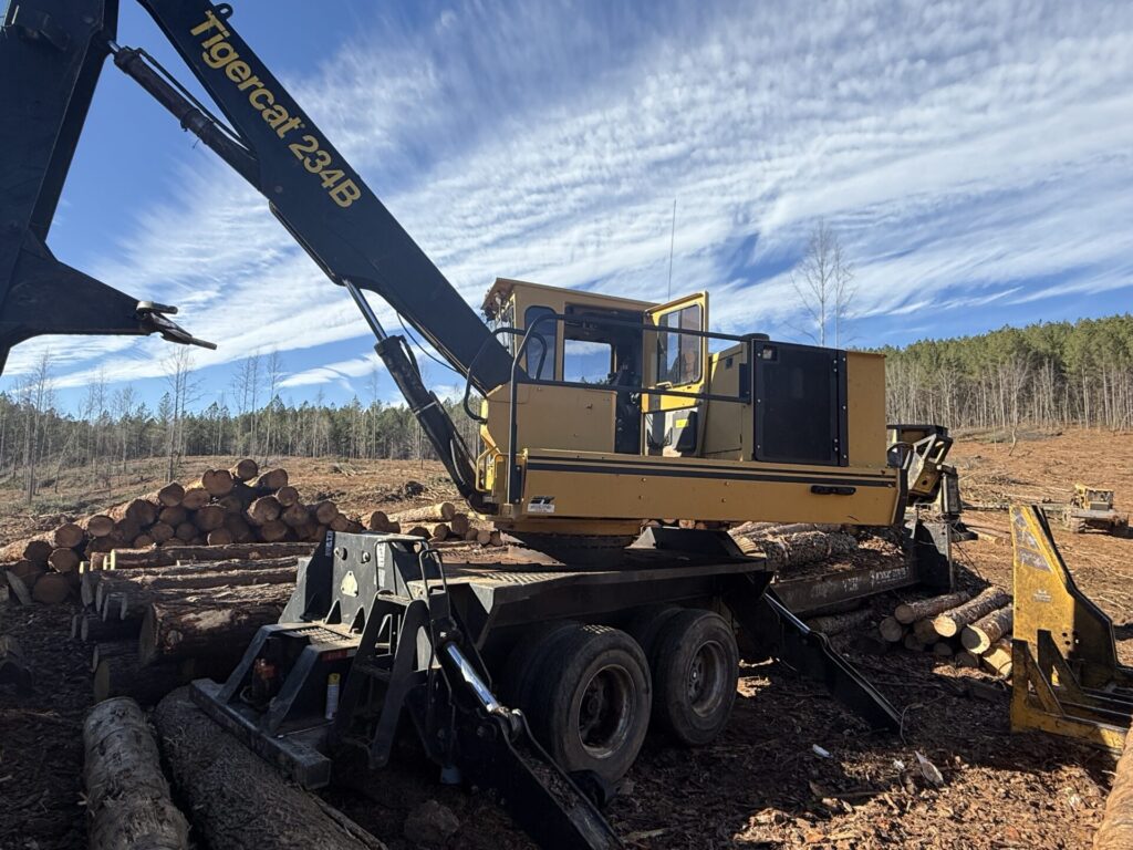 Used 2017 Tigercat 234B Knuckleboom Joystick Log Loader S/N 2342561 with 14,500 hours. Equipped wih Enclosed Cab, Heat, Air, CSI 4 Knife Delimber mounted on a Kodiak Trailer with Hydraulic Landing Legs .